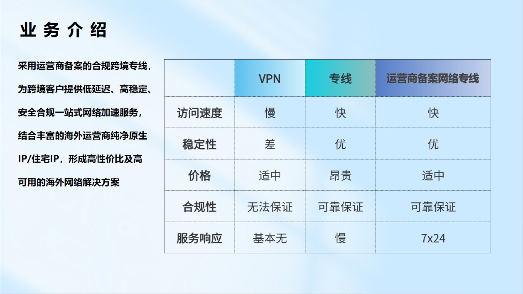 遵從運(yùn)營商規(guī)則,采用運(yùn)營商備案網(wǎng)絡(luò)專線,結(jié)合海外運(yùn)營商純凈獨(dú)享原生IP,提供低延遲、高穩(wěn)定、安全合規(guī)的海外網(wǎng)絡(luò)服務(wù)